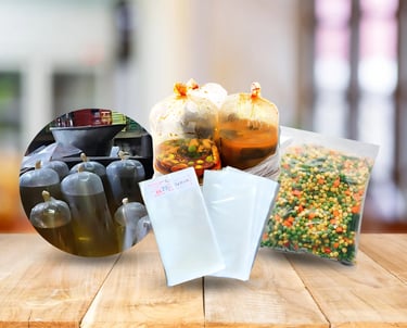 Plastik PE, khususnya jenis LDPE, sering digunakan untuk mengemas makanan berkuah seperti soto, rendang, atau opor yang mengandung minyak dan santan. Sifatnya yang tahan terhadap minyak dan lemak membuatnya ideal untuk mencegah kebocoran, sementara fleksibilitasnya memudahkan penyegelan kemasan. Plastik ini juga mampu menahan suhu hangat, sehingga cocok untuk makanan yang masih hangat.